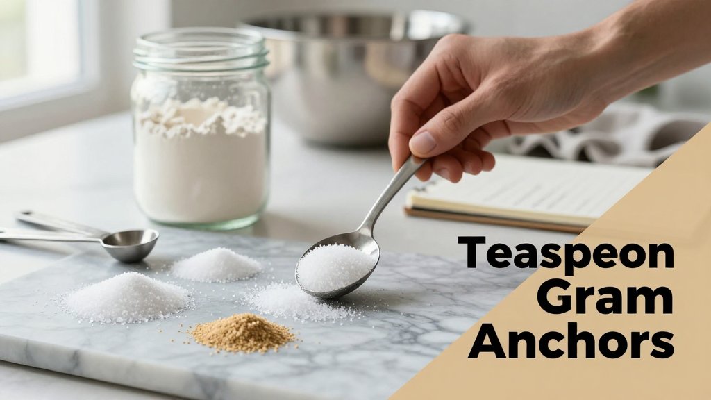Pick one trusted gram target, then make your teaspoon behave like a repeatable tool. Use leveled measuring spoons, fill by spooning into the spoon (no scooping), and tap the spoon once gently to settle, not repeatedly. Write down your working conversions on a sticky note, for example, 1 teaspoon Diamond Crystal kosher salt = 3 g and 1 teaspoon dry yeast = 3 g, then stick with the same brands. For tight-margin ingredients (salt, yeast, baking soda), add a photo-based check: spread the measured ingredient on a plate, snap a bright overhead photo, and use Scale for Grams to catch accidental heaps before they hit the bowl.